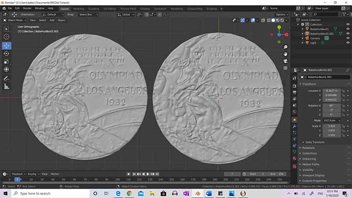 From Sculptris, Correa moved on to a program called Blender. “I also began to teach myself how to use a Results from 3D Modeling using Blender.photogrammetry program called meshroom to see if the 3D model of the medal could be rendered by taking only pictures of it,” said Correa. “I suggested the use of photogrammetry so that the medal would not have to be touched which would reduce the chance of damage to the medals. Finally, it was decided that using an optical profilometer to scan create a digital surface profile of the medal was best, due to higher accuracy.”